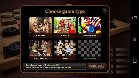 - 13 amusement sorts: English drafts, International (10x10 board), Russian, American pool and "Poddavki" (back checkers), Diagonal, Thai, Turkish, Sparse, Self-Eaters, Brazilian, Blind and Random checkers (10x10 arbitrary put chips with changing development rules). More amusement sorts later on.